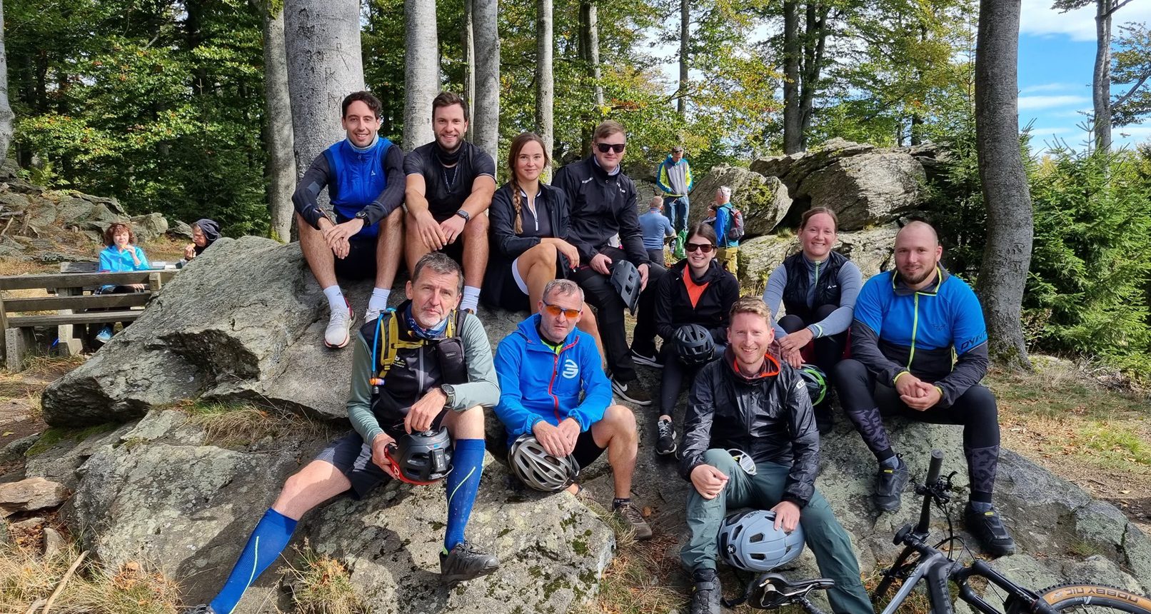 Das Wetter war perfekt, die Sonne strahlte, und die Luft war klar. Die Gruppe erkundete die Wege und Trails rund um den Hirschenstein. Der Gipfel bot eine atemberaubende Aussicht über den Bayerischen Wald. Von hier aus reichte der Blick im Osten vom Großen Arber bis zum Dreisessel, während im Süden der Raum von Deggendorf bis Straubing und im Westen bis zum Gallner zu sehen war.