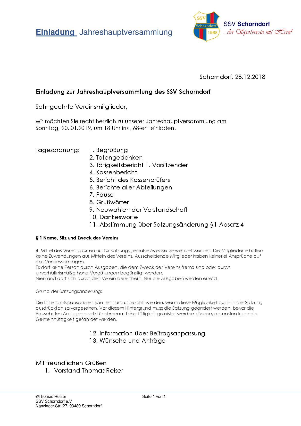 Einladung Jahreshauptversammlung