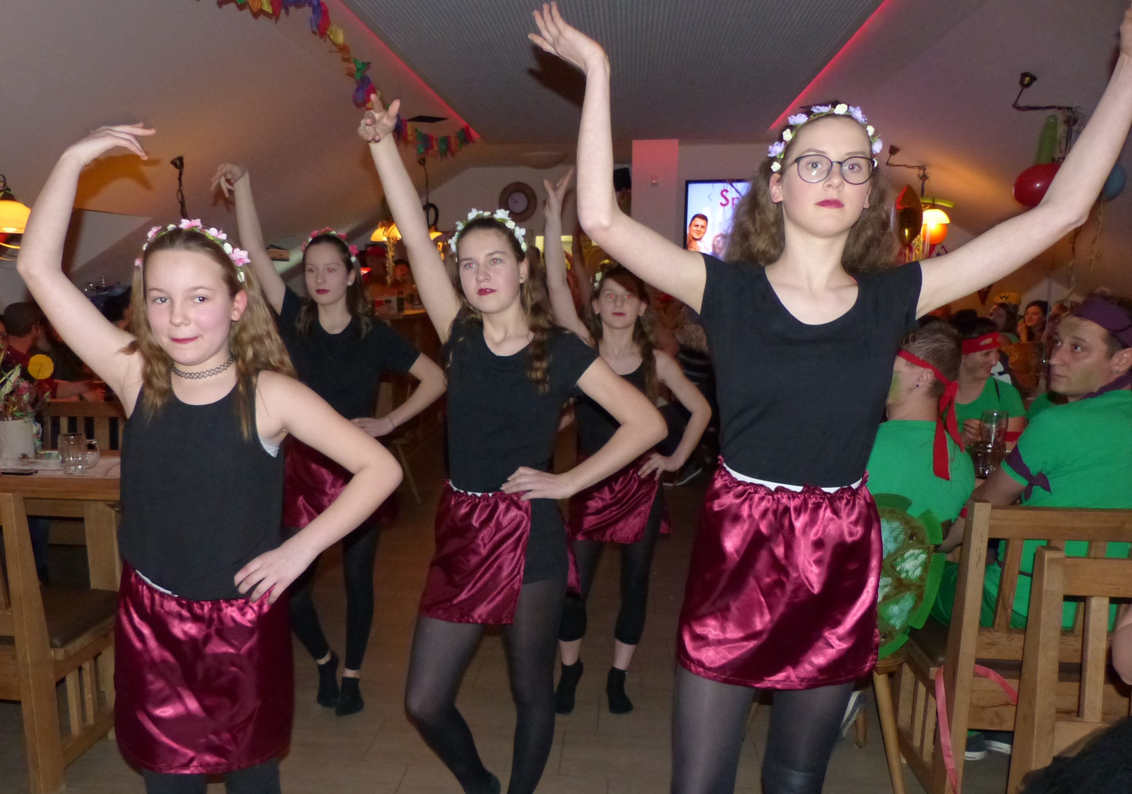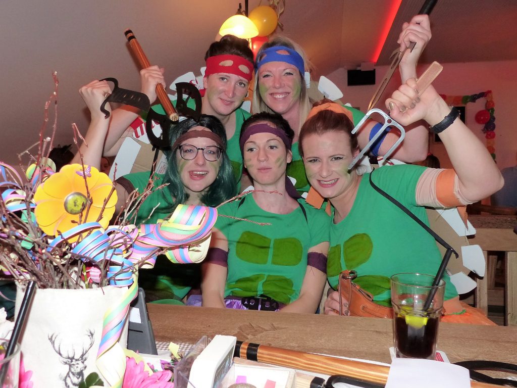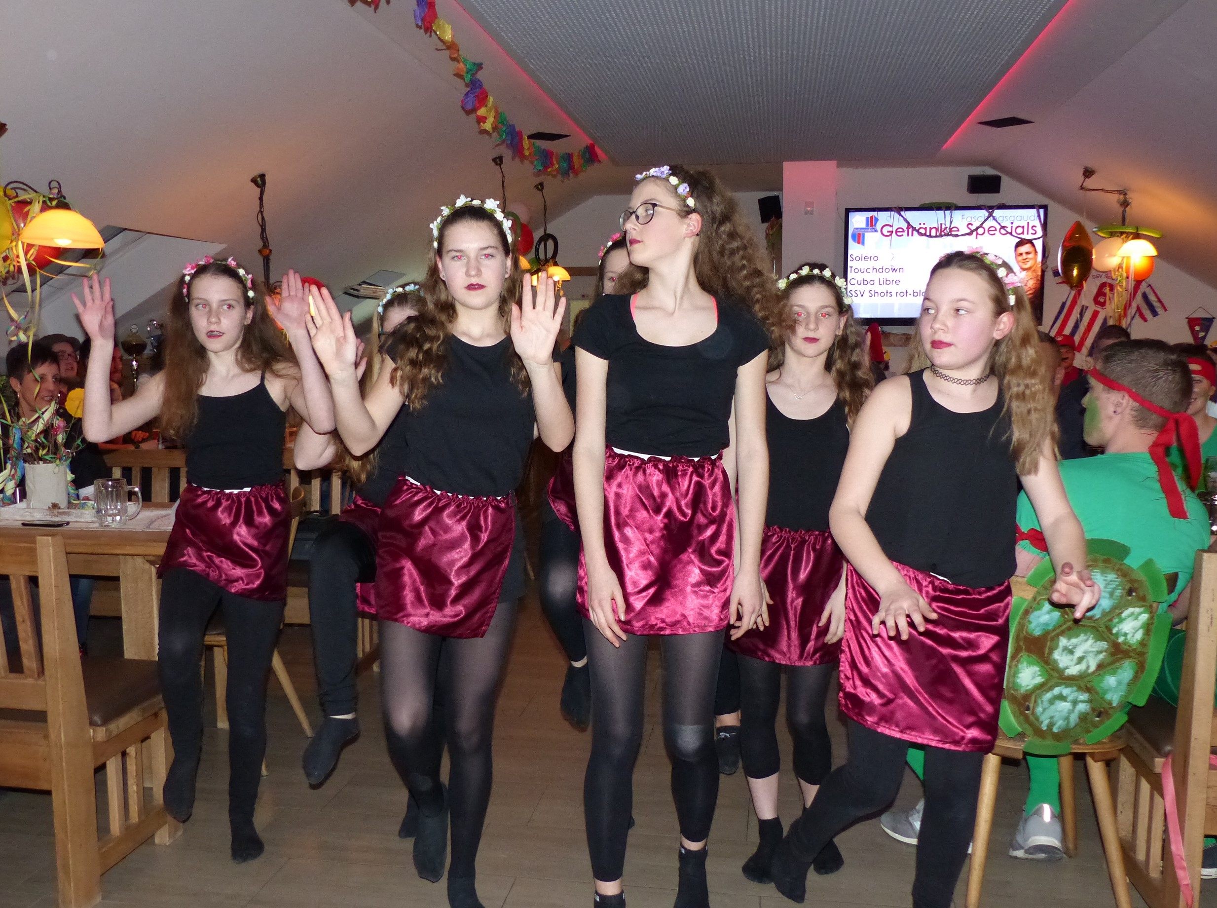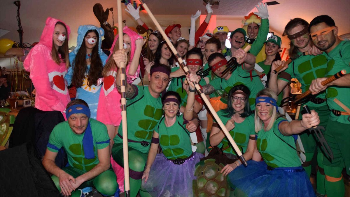 Zu den Höhepunkten der Faschingsgaudi zählten die Choreografien der SSV-Mädchentanzgruppe unter der Leitung von Lea Höcherl, die pantomimische Aufführung eines Kinobesuchs von ganz unterschiedlichen Charakteren durch die aktiven SSV-Ballkünstler Andreas Luger, Christoph Hausladen, Matthias Klaußner, Mario Schlecht, Andreas Weber und Florian Bernhardt sowie zu späterer Stunde die Maskenprämierung. Ganz vorne landeten zwei große Gruppen, auf Platz eins die Ninja-Turtles-Figuren und dahinter die Super-Mario-Figuren. Kompliment: Der neue, junge Fußball-Abteilungsleiter Sebastian Piendl und seine Helfermannschaft hatten nicht nur alles hervorragend vorbereitet, sondern sorgten auch in der langen und stimmungsvollen Nacht für beste Bedingungen. Sowohl in der 68er-Küche als auch hinter der Theke, etwa mit Cocktails und Longdrinks, gab es alle Hände voll zu tun.